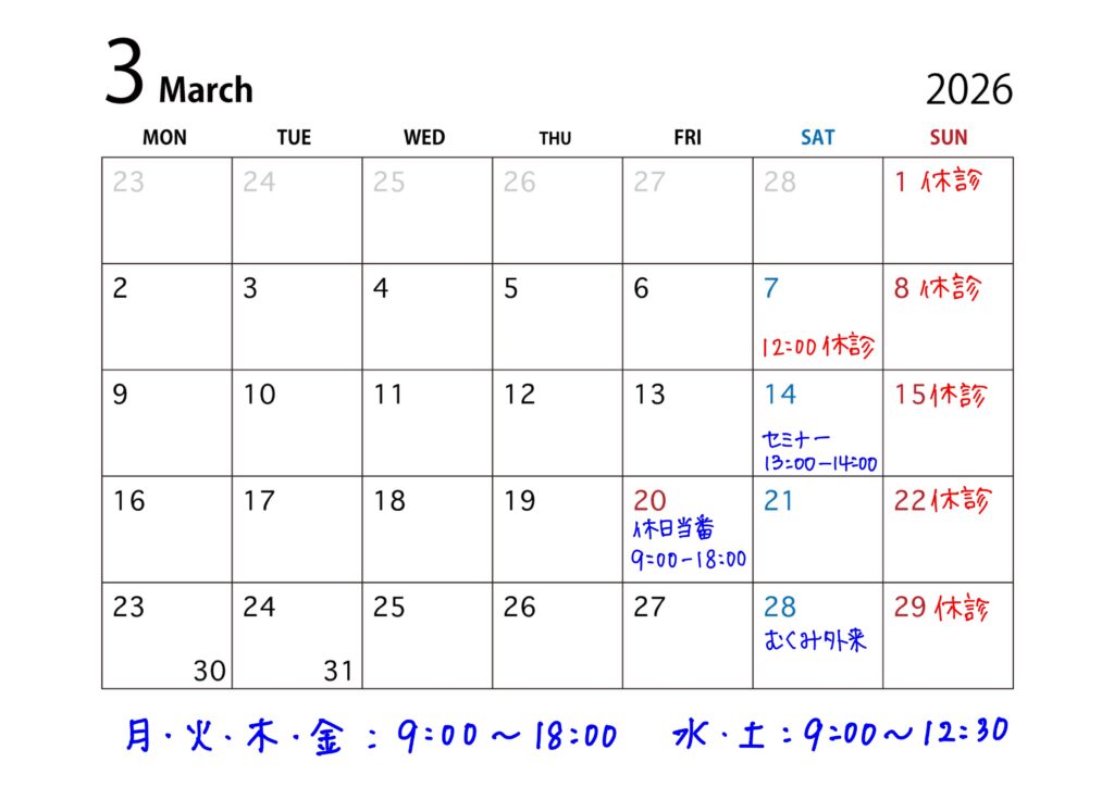 | 午前 9:00~12:30 | 外来 | 手術 | 外来 手術 | 外来 | 手術 | 外来 |
