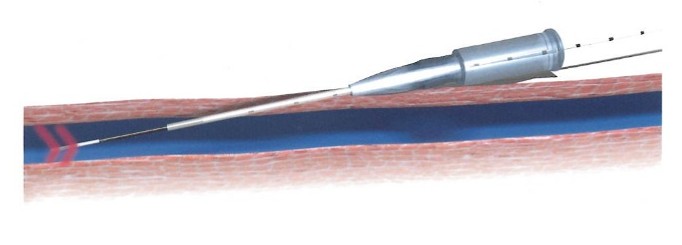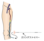 静脈にレーザーファイバーを針穴から挿入し、内側からレーザーを照射し閉塞させる治療。レーザーファイバー先端は2か所から全周性にレーザー照射できる2リングファイバーで、より効率的に静脈を閉塞させることが可能