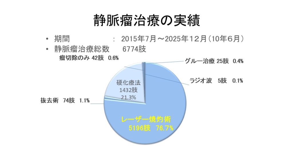 当院では、皆様にとって最も安全で確実な方法を考え、治療を行ってきた結果、微調整可能で静脈瘤の分枝も焼灼可能なレーザー治療が主体で、全身的要因も考慮し必要時グルー治療や硬化療法、静脈瘤が全長にわたり皮膚表面から突出している場合には抜去術も行っております。一つの治療法にこだわらず、あらゆる手段を使ってその方に合った最適な治療を提供しております。